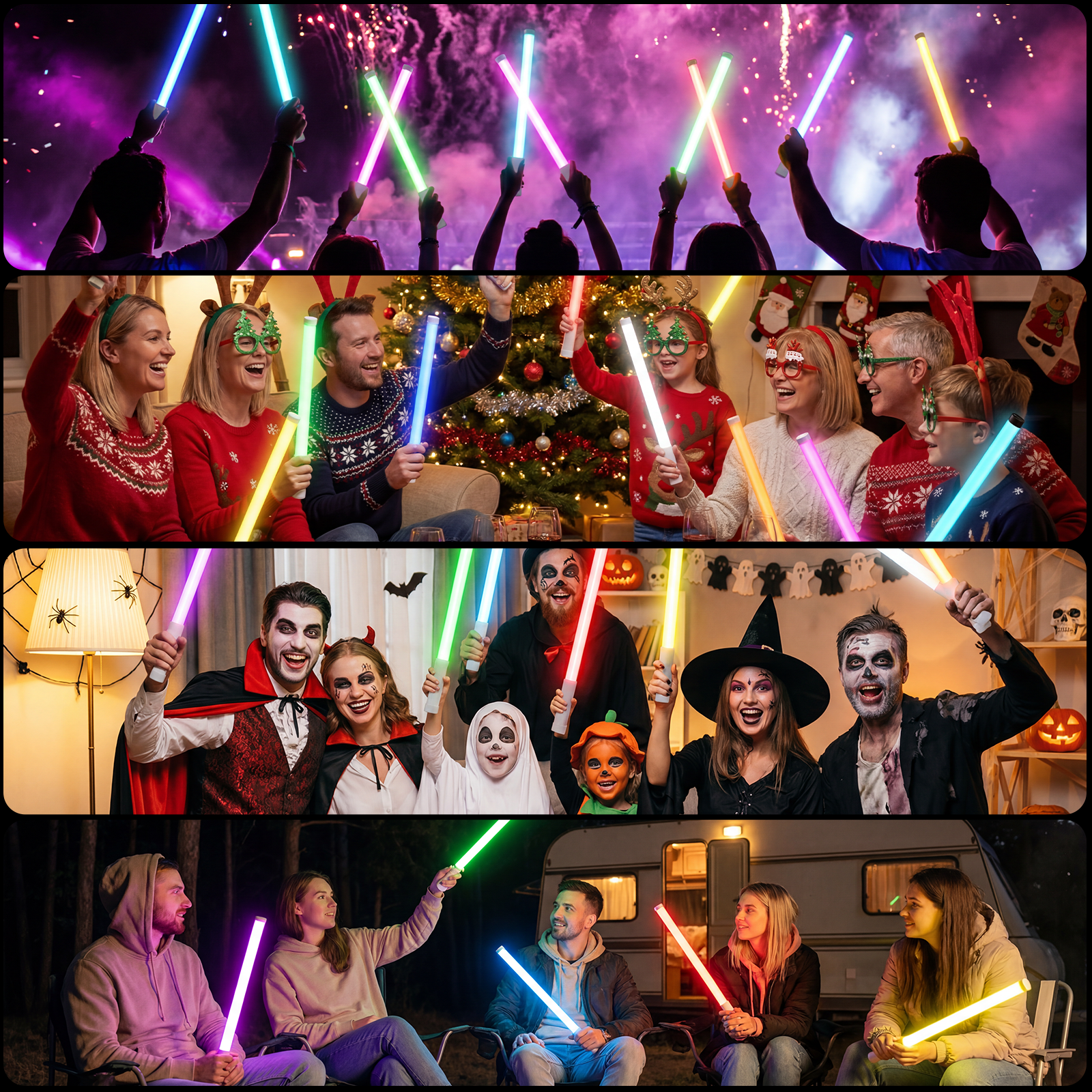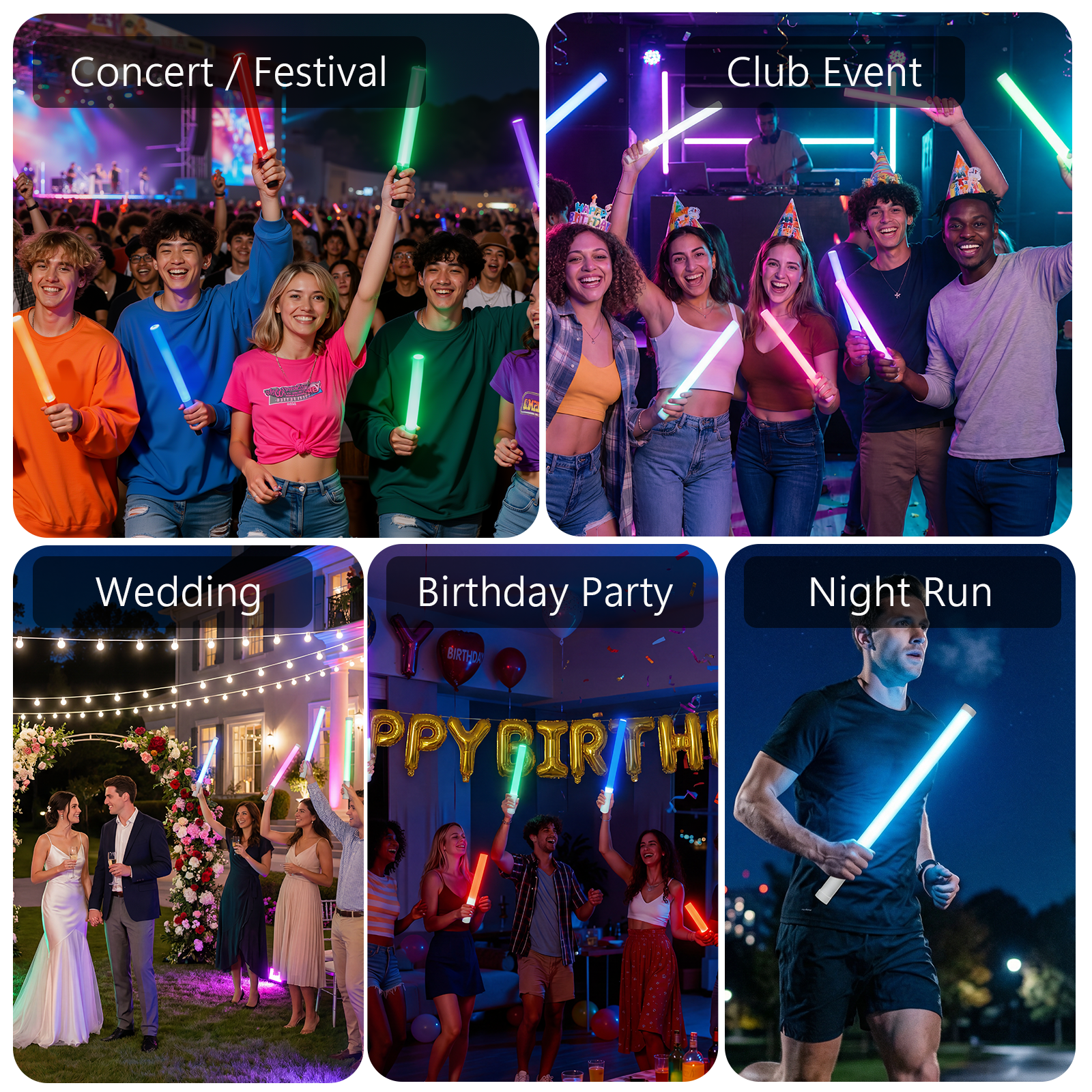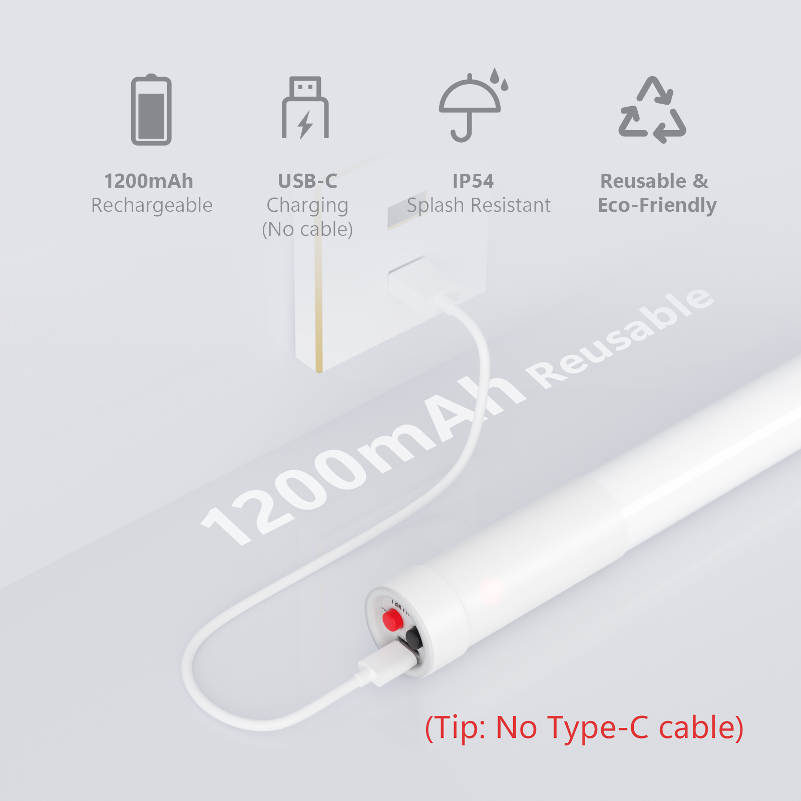 Powered by a 1200mAh rechargeable battery, each glow stick provides over 4 hours of continuous use and charges via USB-C. The durable ABS body with silicone sleeve and IP54 splash resistance makes it suitable for active environments.
