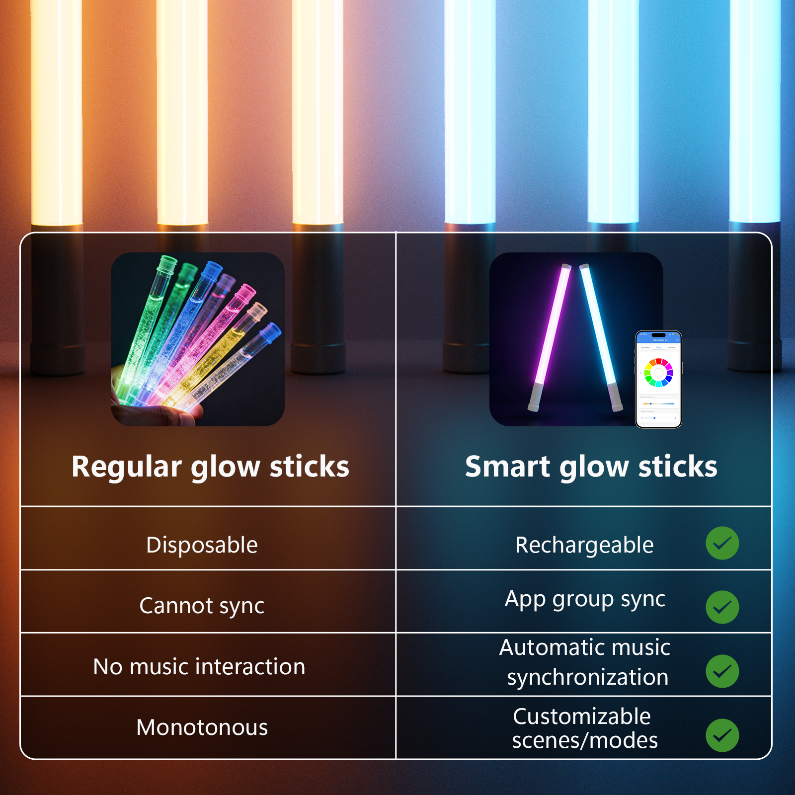 Users can operate the glow sticks using either the built-in button or the MG Light mobile app. The app enables group control for up to 50 devices, music-synced lighting, timing schedules, and custom color scenes. A memory function restores the last used mode after power-off.